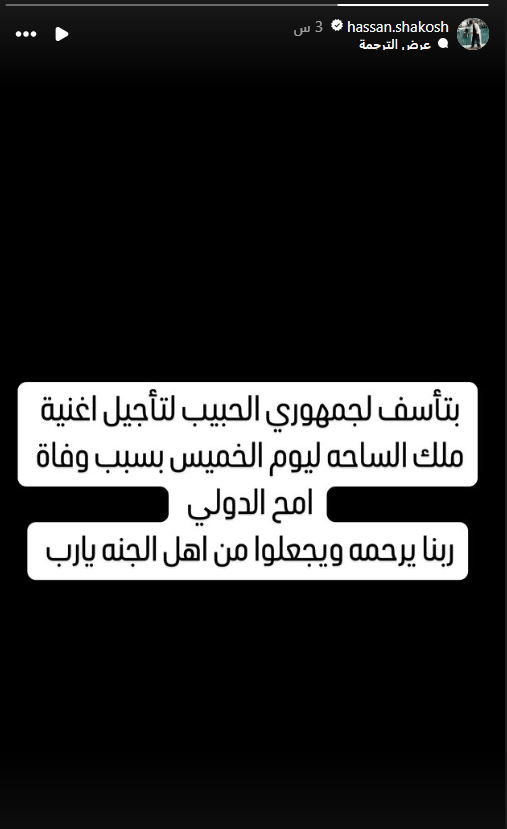 وكتب حسن شاكوش ستوري، عبر حسابه على موقع تبادل الصور والفيديوهات القصيرة انستجرام، قال فيها: بتأسف لجمهوري الحبيب لتأجيل أغنية ملك الساحة، ليوم الخميس بسبب وفاة أمح الدولي، ربنا يرحمه ويجعله من أهل الجنة يا رب.