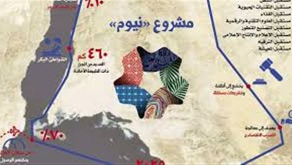ويضم المشروع مساحة ألف كيلو من مصر في أراضي جنوب سيناء وتقع المنطقة شمال غرب المملكة، على مساحة 26.5 ألف كيلو متر مربع، وتطل من الشمال والغرب على البحر الأحمر وخليج العقبة بطول 468 كيلو مترًا، ويحيط بها من الشرق جبال بارتفاع 2500 متر.