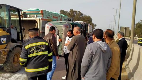 توقف حركة المرور على طريق شبين الكوم - طملاي إثر انقلاب سيارة نقل (صور)