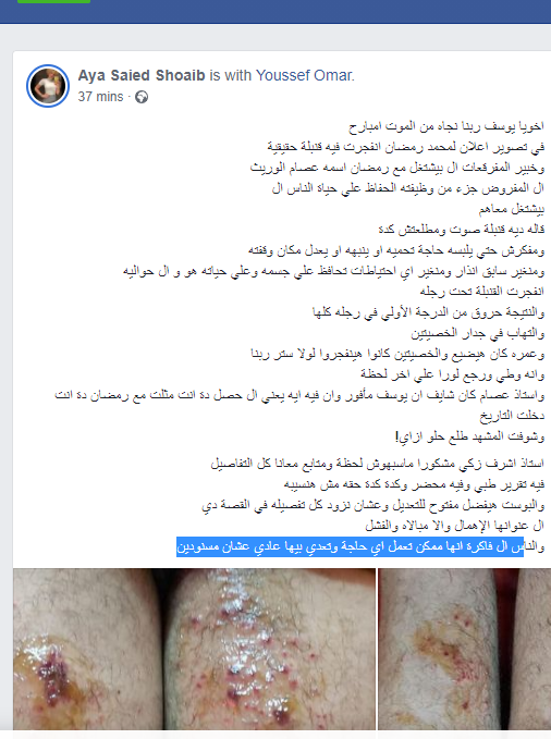 وكانت كتبت شقيقة يوسف عمر المشارك بالإعلان في المنشور الخاص بها على "فيس بوك"، قائلة: "أخويا يوسف ربنا نجاه من الموت امبارح.. في تصوير إعلان لمحمد رمضان انفجرت فيه قنبلة حقيقية.. وخبير المفرقعات اللي بيشتغل مع رمضان اسمه عصام الوريث.. اللي المفروض جزء من وظيفته الحفاظ على حياة الناس اللي بيشتغل معاهم.. قاله دي قنبلة صوت ومطلعتش كدة.. ومفكرش حتى يلبسه حاجة تحميه أو ينبهه أو يعدل مكان وقفته".