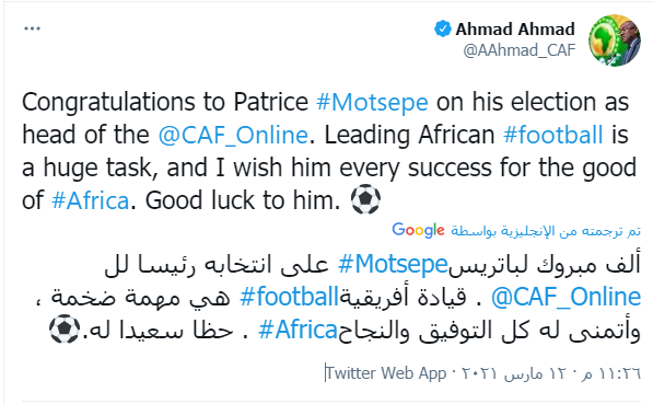 وكتب أحمد أحمد عبر حسابه الرسمي على موقع التواصل الاجتماعي "تويتر"، ألف مبروك لباتريس، على انتخابه رئيسا للاتحاد الإفريقي لكرة القدم "كاف"، قيادة إفريقية، هي مهمة ضخمة، وأتمنى له كل التوفيق والنجاح، وحظ سعيد".