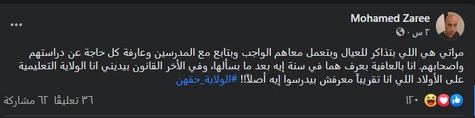 وكتب حساب يحمل اسم محمد: "مراتي هي اللي بتذاكر للعيال وبتعمل معاهم الواجب وبتتابع مع المدرسين وعارفة كل حاجة عن دراستهم وأصحابهم، أنا بالعافية بعرف هما في سنة إيه بعد ما بسألها، وفي الآخر القانون بيديني أنا الولاية التعليمية على الأولاد اللي أنا تقريبًا معرفش بيدرسوا إيه أصلاً!!".