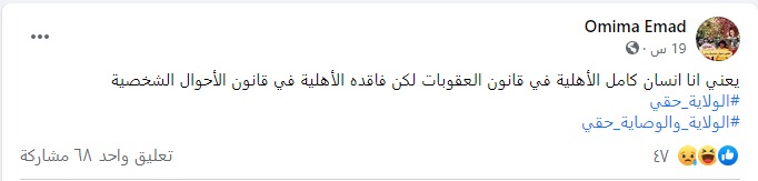 أما "أمنية عماد" فكتبت معترضة على عدم أحقية المرأة في الولاية عبر "فيس بوك": "يعني أنا إنسان كامل الأهلية في قانون العقوبات لكن فاقدة الأهلية في قانون الأحوال الشخصية"، مستخدمة الهاشتاج نفسه.