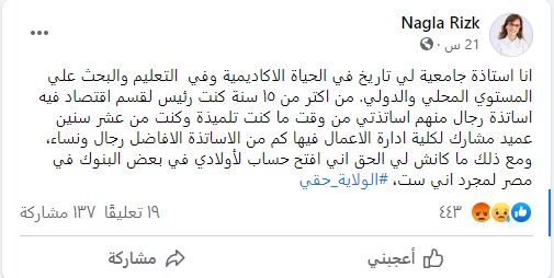 بينما أبدت "نجلاء رزق" اعتراضها على تعنت القانون ضد النساء، فقالت في منشور لها على "فيس بوك": "أنا أستاذة جامعية لي تاريخ في الحياة الأكاديمية وفي التعليم والبحث على المستوى المحلي والدولي. من أكثر من 15 سنة كنت رئيسًا لقسم اقتصاد فيه أساتذة رجال، منهم أساتذتي من وقت ما كنت تلميذة".
