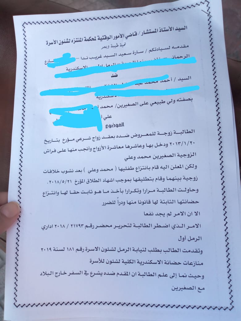 خلاف في وجهات النظر استحالت معه العشرة بين زوج وزجته، دفع ثمنه الأطفال والأم التي حُرمت من فلذات أكبادها، هذا مع حدث مع "سارة" حيث انفصلت عن زوجها بشكل غير رسمي لمدة ثلاث سنوات من 2015 وحتى 2018، وتركت بيت الزوجية وذهبت للعيش مع عائلتها، لتتفاجأ بعد ذلك بهروب الزوج وسفره إلى الخارج دون علمها، وحين علمت أخبرها أنه يحاول جمع المال حتى يتمكن من الإيفاء بحقوقها المالية ما بعد الطلاق.