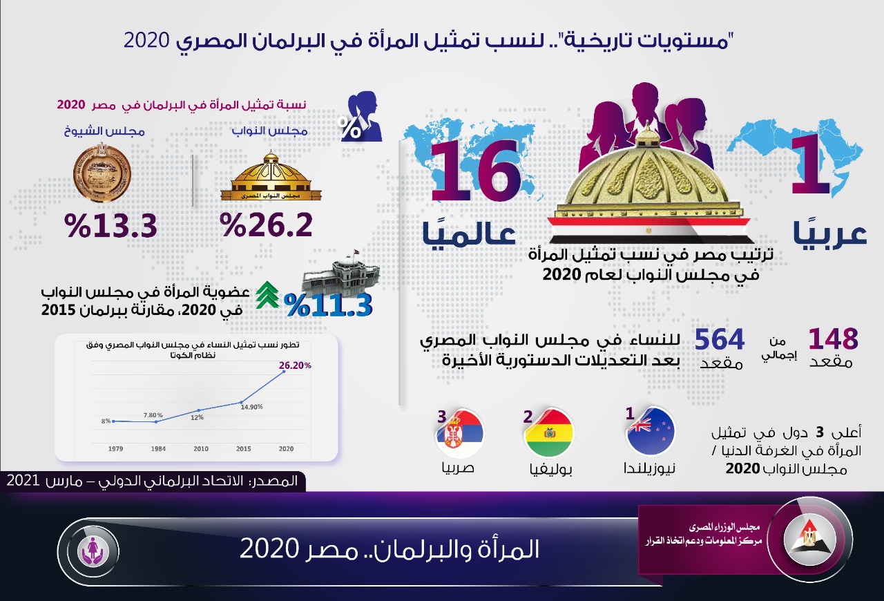 نشر مركز المعلومات ودعم اتخاذ القرار إنفوجرافيك جديدًا بعنوان "مستويات تاريخية"، لنسب تمثيل المرأة في البرلمان المصري 2020".