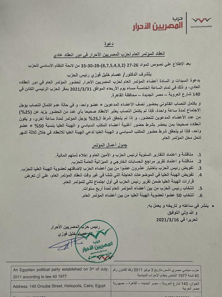 دعا عصام خليل فوزي، رئيس حزب المصريين الأحرار، أعضاء المؤتمر العام للحزب، لحضور المؤتمر العام في دور انعقاده العادى، ذلك في تمام الساعة الخامسة مساء يوم الأربعاء الموافق 31 مارس 2021، بمقر الحزب الرئيسي الكائن في 140 شارع العروبة بمصر الجديدة في محافظة القاهرة.