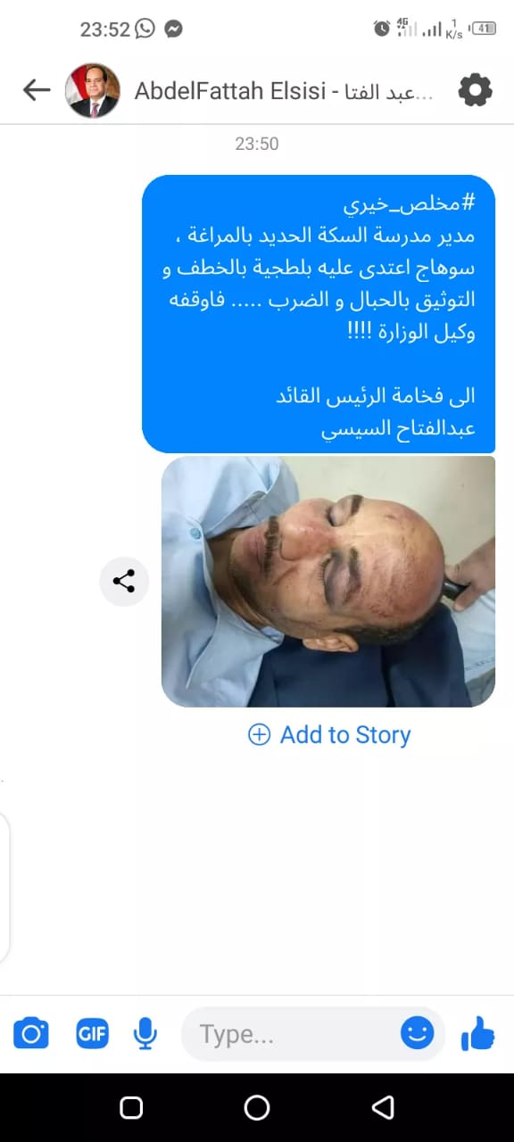 إنه لما يدمى قلبي و يؤجج مشاعري أن أتوجه لسيادتكم بهذه الكلمات النازفة شاكيًا للمولى قبل البشر أفعال بعض شرار البشر أكتب لسيادتكم و انا بجوار اخي و شقيقى الاصغر الاستاذ مخلص خيري ابوزيد علي، مدير مدرسة السكة الحديد الابتدائية، بمدينة المراغة محافظة سوهاج , و الذي تعرض اليوم لحادث اختطاف واعتداء بالضرب من اقارب وكيلة المدرسة س. م. ا. والمعروف عنها المشاكل وعدم الالتزام من قبل حتى أن يتولى أخي أدارة المدرسة منذ عام واحد فقط وبينما نحن ننتقل من قسم الى قسم ومن معمل الى اشعة للاطمئنان على جسده المثخن بالجراح فاذا بنا نعلم من الصحف الإلكترونية فقط ليس اكثر بان كل ما قام به وكيل الوزارة هو استبعاد الجانى و المجنى عليه , بينما تشهد قرية الضياع كلها محل المدرسة والواقعة بأنه تم اختطافه فى وضح النهار من امام المدرسة وربطه بالحبال واقتياده الى منزل الوكيلة المذكورة التى انصرفت قبله بقليل لتعطي الاشارة لزوجها وأقاربها بالتنفيذ وكأننا في غابة لا دولة تحكمها سيادة القانون لذا أهيب بسيادتكم أن تأخذوا الحق للمجنى عليه حفاظًا على هيبة الحق و العدل و الدولة و القانون على مستوى الشق الاداري وقد تم عمل التقارير و المحضر اللازم بالواقعه على نطاق الشق الجنائي و لكن مما اصابنى بالحزن ان اجد المجنى عليه يوضع فى كفة الجانى على حد سواء حتى لو كان ذلك لمجرد انتهاء التحقيقات التى اثق فى عدالتها و نزاهتها فى ان تعطي المجنى عليه حقه فى عهد الرئيس القائد عبدالفتاح السيسي الذي لا يرضيه مثل هذه الوقائع المفجعه فى ظل دولة القانون التى تولي عقابًا رادعا لمن سولت لهم أنفسهم ارتكاب هذه الجريمة علنا فى وضح النهار فهلا حفظنا للمخلصين و الشرفاء حقوقهم الأدبية قبل الجنائية و ساندنا كل من يقوم بواجبه في مواجهة الفاسدين و المفسدين و المستهينين بالقانون أمثال هذه الوكيلة وأقاربها من البلطجية وخارقى القانون، فيا غوثاه، يا غوثاه، يا غوثااااااه".