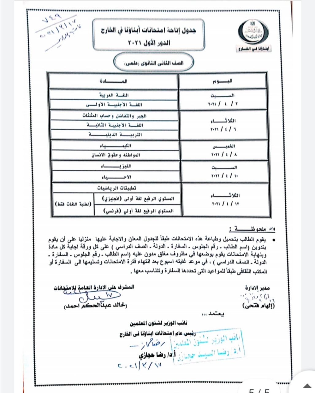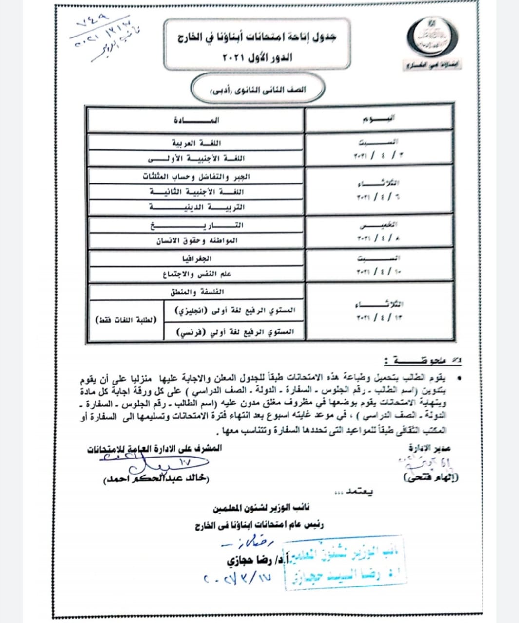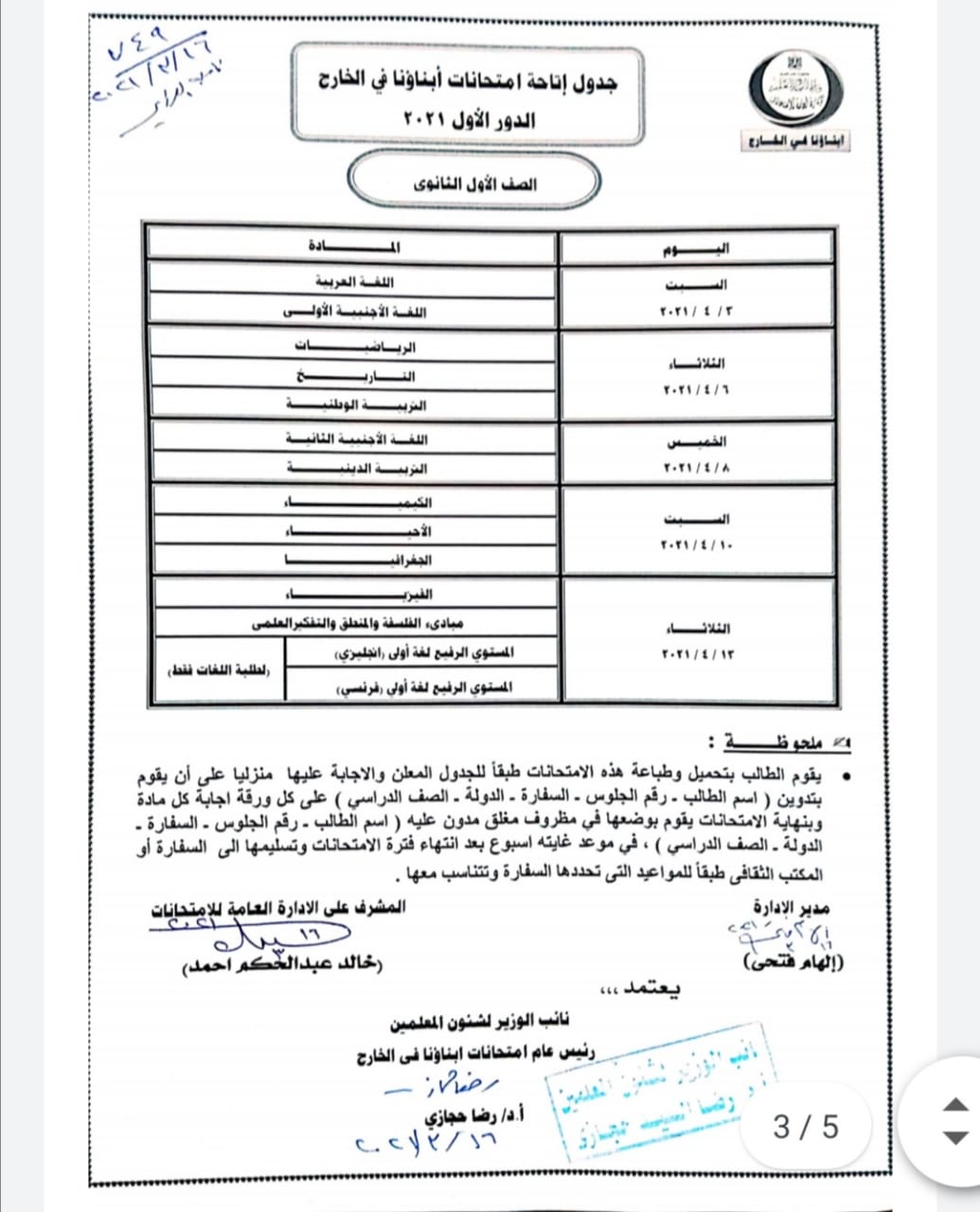 وأوضحت الوزارة أنه سيتم إتاحة الامتحانات على موقع أبنائنا في الخارج (https://sabroad.emis.gov.eg) في المواعيد المحددة في الجدول لكل مادة، مشيرة إلى أن الطالب سيقوم بطباعتها والإجابة عنها في المنزل، حيث إنها بنظام الكتاب المفتوح open book وتدوين (الاسم رباعي- رقم الجلوس- السفارة- الدولة - الصف الدراسي) على كل ورقة إجابة لكل مادة، ويتم تسليمها للسفارة أو المكتب الثقافي طبقًا للمواعيد التي تحددها السفارة.