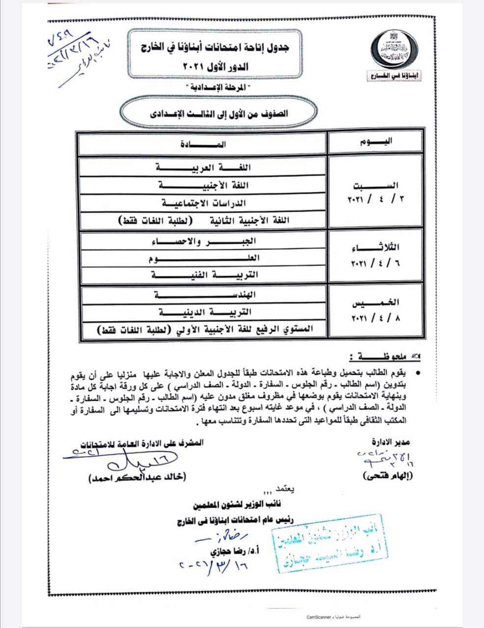 أعلنت وزارة التربية والتعليم والتعليم الفني، في إطار الاستعدادات النهائية لعقد امتحانات الطلاب في الخارج للعام الدراسي 2021/2020، جداول امتحانات الصفوف الدراسية (من الرابع الابتدائي حتى الثاني الثانوي) وفقًا لنظام دراسة الطالب (عربي أو لغات أو دمج)، التي من المقرر أن تبدأ يوم السبت الموافق 3 أبريل 2021.