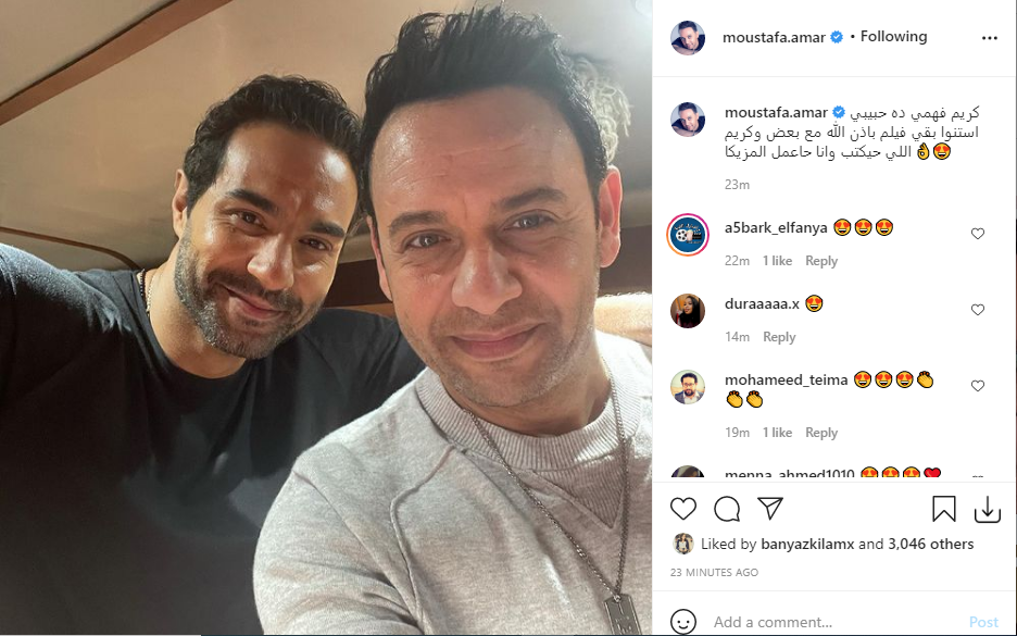 ونشر مصطفى صورة تجمعه بكريم فهمي، عبر حسابه الشخصي على موقع تبادل الصور والفيديوهات القصيرة “انستجرام”، وعلق قائلًا: “كريم فهمي ده حبيبي استنوا بقي فيلم بإذن الله مع بعض وكريم اللي حيكتب وأنا حاعمل المزيكا”.