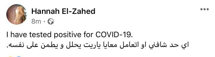 وكتبت هنا الزاهد عبر حسابه الشخصي على موقع التواصل الاجتماعي “فيسبوك”: “أنا إيجابي فيروس كورونا، أي حد شافني أو اتعامل معايا ياريت يحلل ويطمن على نفسه”.