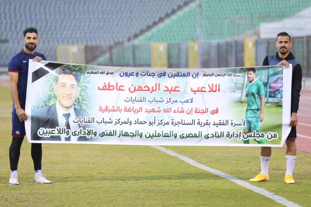 حرص لاعبو الفريق الأول لكرة القدم بالنادي المصري وأعضاء الجهاز الفني بقيادة علي ماهر قبيل بدء مران اليوم على تأبين اللاعب عبد الرحمن عاطف لاعب مركز شباب القنايات والذي وافته المنية منذ أيام قليلة خلال مباراة فريقه بدوري القسم الرابع أمام نادي الرواد.