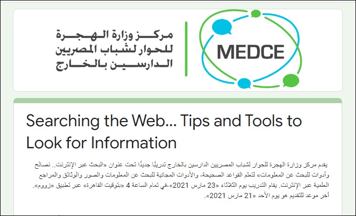 ويدور التدريب حول البحث عبر جوجل، ومحركات البحث البديلة والمتخصصة للحصول على معلومات أكثر دقة في مجال بعينه، وطرق البحث عن الصور، وكيفية تفعيل “إشعارات جوجل” في عملية البحث، مع تدريب عملي في نهاية التدريب، الذي يبدأ تمام الرابعة مساء الثلاثاء الموافق 23 من مارس، عبر تطبيق “زووم” ولمدة 90 دقيقة.