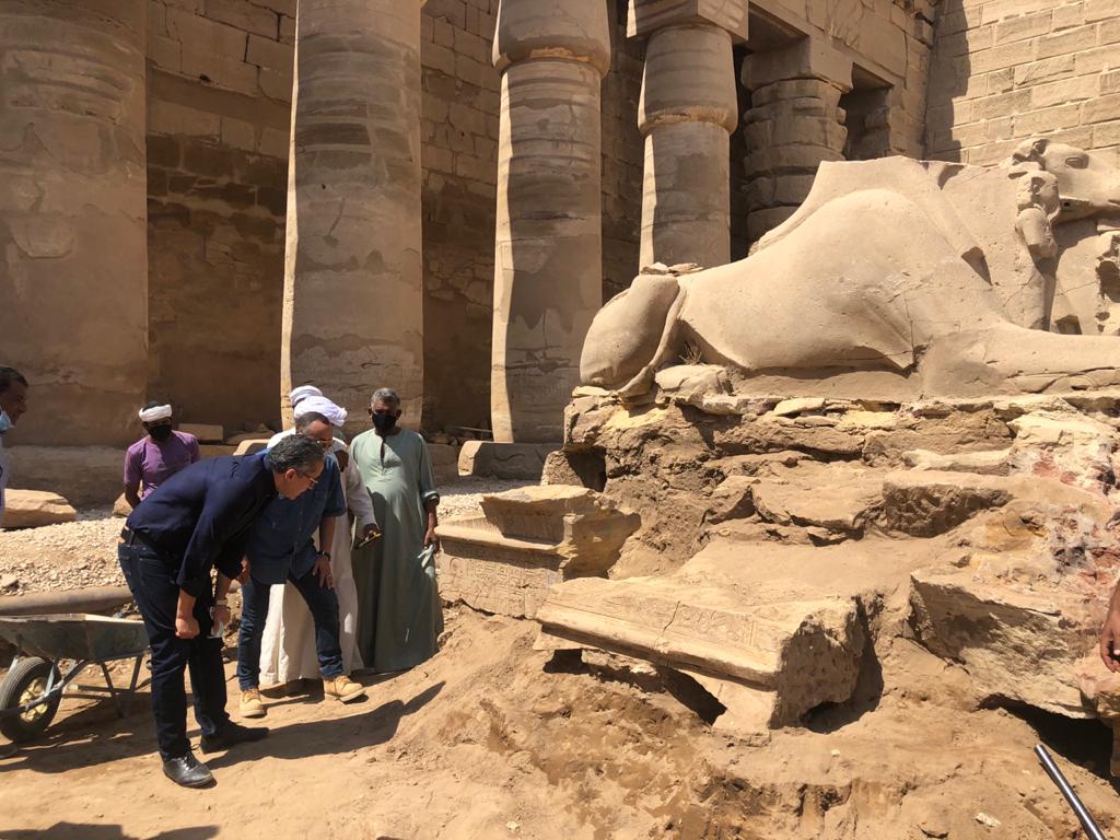وأشار إلى أن  منذ فترة تم افتتاح المرحلة الأولى من مشروع ترميم مجموعة تماثيل الكباش الموجودة خلف الصرح الأول بمعبد آمون رع بمعابد الكرنك بمدینة الأقصر، وبعد رفع الكباش، قام فریق العمل بإجراء حفائر حول صف الكباش وأسفل المصطبة المفرغة، مما أسفر الكشف عن مجموعة من الفخار والكتل الحجرية المعاد استخدامها ويعكف أعضاء فريق العمل الآن على دراساتها لمعرفة التاريخ الصحيح لنقل تلك الكباش من مكانها الأصلي بوسط الفناء المفتوح إلى مكانها الحالي، و ذلك خلال العصور المصرية القديمة.