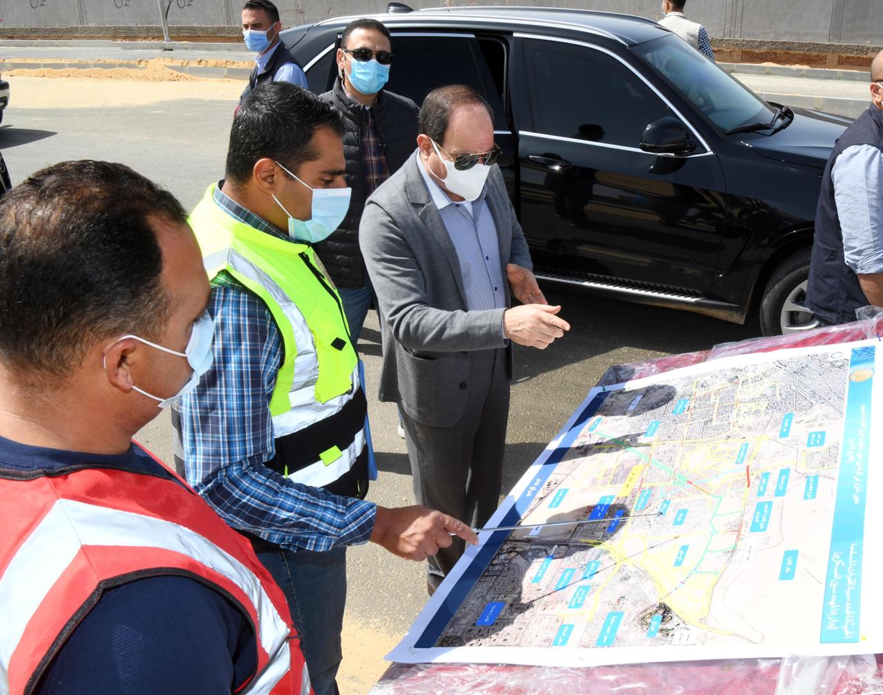وقد أطلع أحد المسئولين بأحد مواقع العمل بمنطقة التجمع الخامس الرئيسَ على الموقف التنفيذي لعدد من المحاور والطرق، ووجه الرئيس بضمان توفير كافة الخدمات اللازمة للمركبات ومرتادي الطرق الجديدة، أخذاً في الاعتبار الأهمية الكبرى لتلك المحاور في تعزيز عملية التنمية وتنظيم الحركة المرورية وسرعة التنقل.