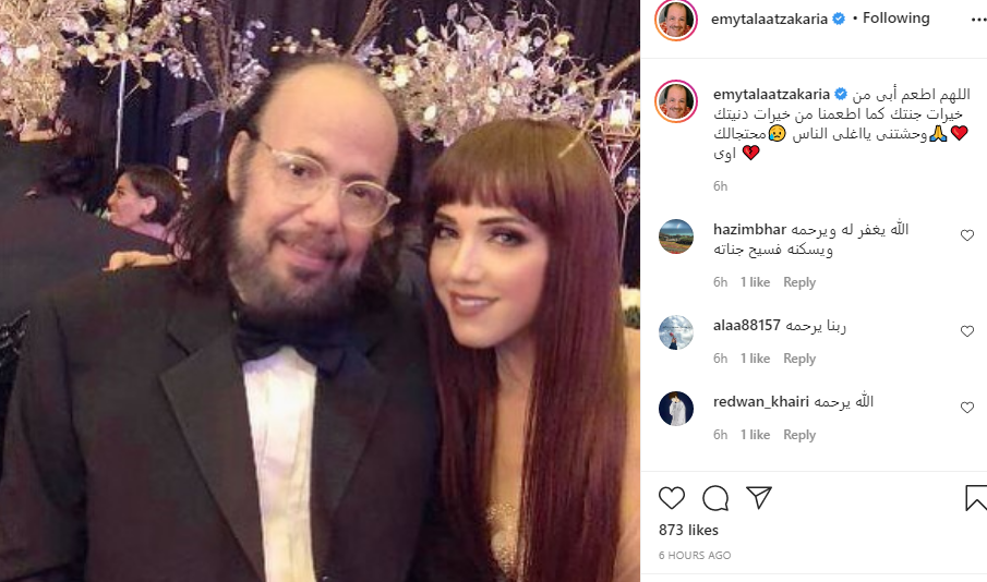 ونشرت إيمي صورة لها مع والدها، عبر صفحتها الرسمية بموقع تبادل الصور والفيديوهات الشهير "انستجرام"، وعلقت عليها قائلة: "اللهم أطعم ابي من خيرات جنتك كما أطعمنا من خيرات دنيتك.. وحشتني يا أغلى الناس.. محتجالك أوي".