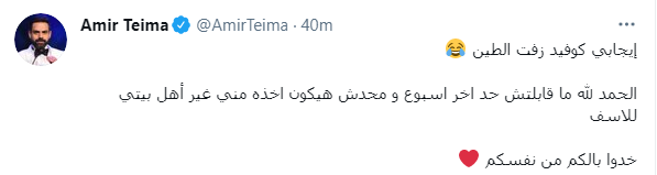 وكتب طعيمة، عبر حسابه الشخصي على موقع التغريدات القصيرة “تويتر”: “إيجابي كوفيد زفت الطين، الحمد لله ما قابلتش حد آخر أسبوع، ومحدش هيكون أخده مني غير أهل بيتي للأسف، خدوا بالكم من نفسكم”.