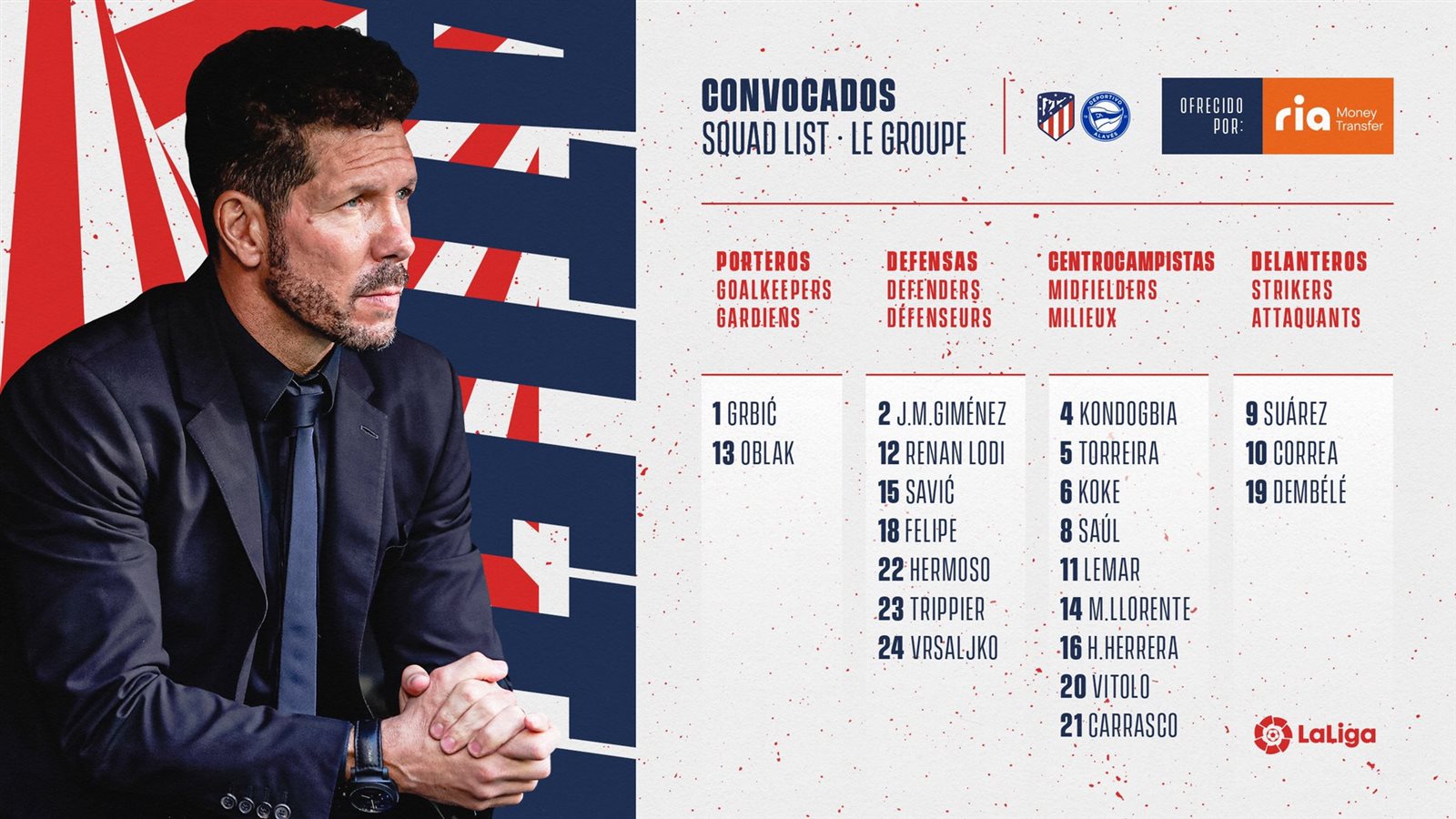 أعلن الأرجنتيني دييجو سيميوني، المدير الفني لفريق أتلتيكو مدريد، قائمة فريقه الرسمية لمواجهة ديبورتيفو ألافيس، غداً الأحد، في مسابقة الدوري الإسباني الممتاز.