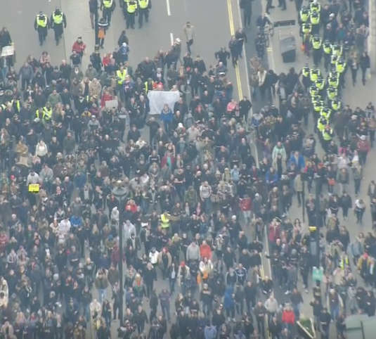 خرج آلاف المحتجين البريطانيين، اليوم السبت، في مسيرات حاشدة في شارع أكسفورد، احتجاجا على قرارات الحكومة البريطانية الخاصة بالإجراءات الاحترازية للحد من انتشار فيروس كورونا المستجد كوفيد 19، وفقًا لما نشرته وكالة رويترز للأنباء.