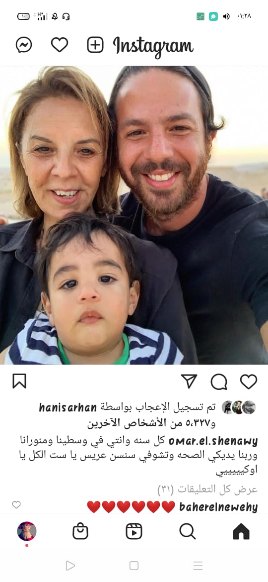 وحرص الفنان عمر الشناوي علي تهنئة والدته بمناسبة عيد الام، من خلال نشر صورة تجمعه بها هي وابنه، وعلق عليها قائلا:" كل سنة وانتي في وسطينا ومنورانا، ربنا يديكي الصحة، وتشوفي سنين عريس يا ست الكل يا اوكي".