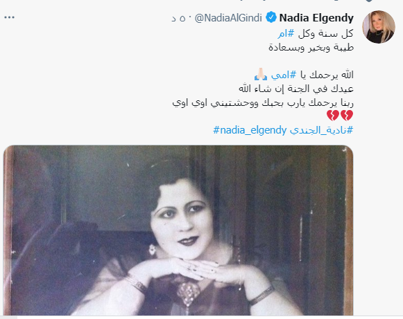 نشرت الفنانة نادية الجندي صورة لوالدتها، عبر صفحتها الرسمية بموقع التغريدات القصيرة "تويتر"، وغردت: "كل سنة وكل أم طيبة وبخير وسعادة.. الله يرحمك يا أمي عيدك في الجنة إن شاء الله، ربنا يرحمك يارب، بحبك ووحشتيني اوي اوي".