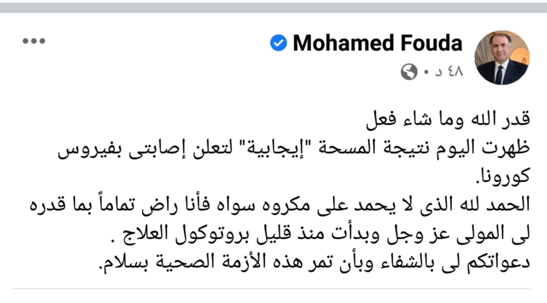 وأضاف الإعلامى في منشوره:ظهرت اليوم نتيجة المسحة "إيجابية" لتعلن إصابتى بفيروس كورونا، الحمد لله الذى لا يحمد على مكروه سواه فأنا راض تماماً بما قدره لى المولى عز وجل وبدأت منذ قليل بروتوكول العلاج، مختتما: "دعواتكم لى بالشفاء وبأن تمر هذه الأزمة الصحية بسلام".