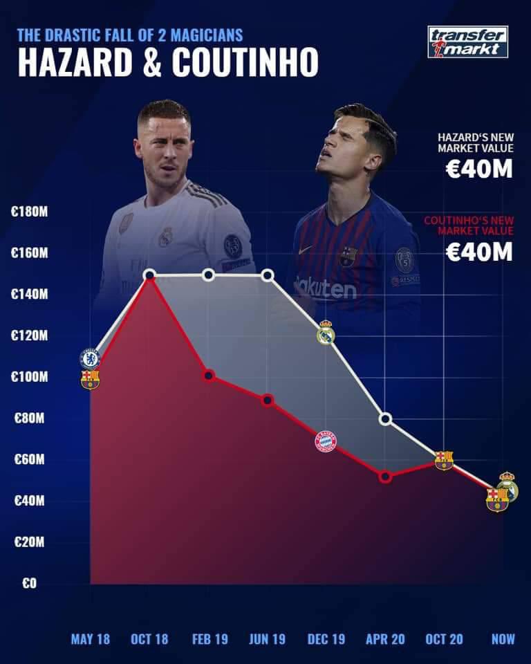 كما أشار الموقع إلى أن القيمة السوقية للبرازيلي فيليبي كوتينو، نجم فريق برشلونة انخفضت قيمته السوقية هو الأخر لتصبح مثل هازارد 40 مليون يورو فقط.