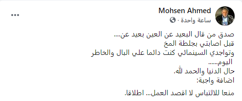 وكتب محسن عبر حسابه الشخصي على موقع التواصل الاجتماعي “فيسبوك”: “صدق من قال البعيد عن العين بعيد عن.. قبل إصابتي بجلطة المخ وتواجدي السينمائي كنت دائمًا على البال والخاطر.. اليوم.. حال الدنيا والحمد لله..إضافة واجبة.. منعًا للالتباس لا أقصد العمل.. إطلاقا”.