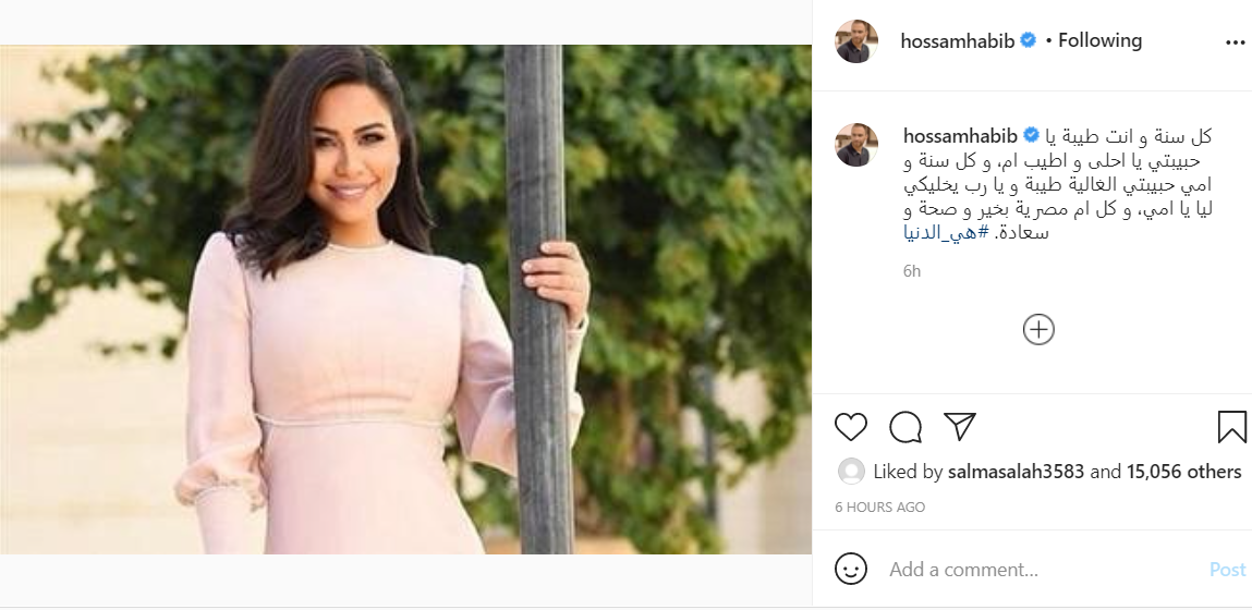 ونشر حسام حبيب، صورة لزوجته الفنانة شيرين عبد الوهاب، عبر حسابه الشخصي بموقع تبادل الصور والفيديوهات القصيرة “انستجرام”، وعلق عليها قائلًا:"كل سنة و انت طيبة يا حبيبتي يا أحلى وأطيب أم، و كل سنة وأمي حبيبتي الغالية طيبة ويا رب يخليكي ليا يا أمي، و كل أم مصرية بخير وصحة وسعادة".