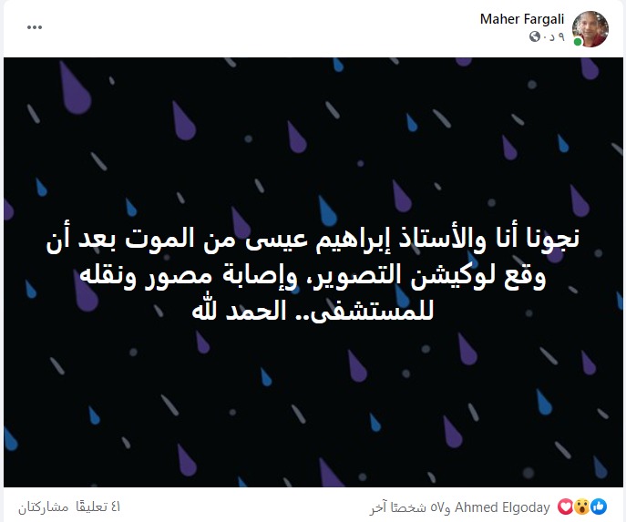 وكتب "فرغلي" عبر صفحته الرسمية على موقع التواصل الاجتماعي "فيس بوك": “نجونا أنا والأستاذ إبراهيم عيسى من الموت بعد أن وقع لوكيشن التصوير، وإصابة مصور ونقله للمستشفى.. الحمد لله”.