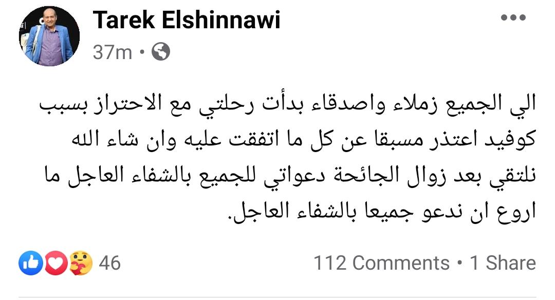 وكتب طارق عبر حسابه الشخصي على موقع التواصل الاجتماعي “فيس بوك”: “إلى الجميع زملاء وأصدقاء بدأت رحلتي مع الاحتراز بسبب كوفيد اعتذر مسبقًا عن كل ما اتفقت عليه وإن شاء الله نلتقي بعد زوال الجائحة دعواتي للجميع بالشفاء العاجل ما أروع أن ندعو جميعًا بالشفاء العاجل”.