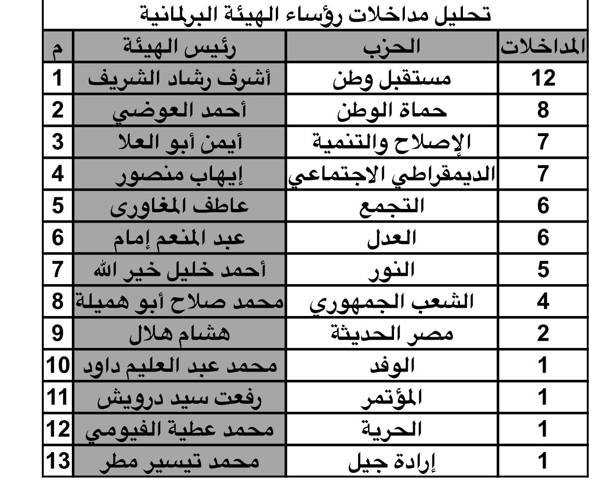 فيما يتعلق بمداخلات رؤساء الهيئات البرلمانية، فقد جاء بالورقة أنه على الرغم من أن تلك الجلسات قد شهدت مشاركة 461 نائبا بعدد 1227م داخلة بمتوسط 2,66 مداخلة لكل مشاركـ فإن رؤساء الهيئات قد اكتفوا بعدد 61 مداخلة بمتوسط 4,7 مداخلة لكل منهم، كان من الغريب أن هناك 6 منهم لم يصلوا إلى هذا المتوسط، إضافة لأن 4 من رؤساء الهيئات البرلمانية قد اكتفى كل منهم بمداخلة وحيدة خلال وجود 28 وزيرا في 15 جلسة عامة، بل وصل الأمر إلى أنه من بين الأعلى تفاعلا وحديثا خلال جلسات الوزراء لم يظهر من رؤساء الهيئات البرلمانية سوى ممثلي مستقبل وطن، وحماة وطن، بينما غاب عن المركزالعشرة الأولى ممثلي 11 حزبا سياسيا في موقف يستدعي مراجعة وإعادة توجيه للأداءات البرلمانية لتلك النخب البرلمانية.