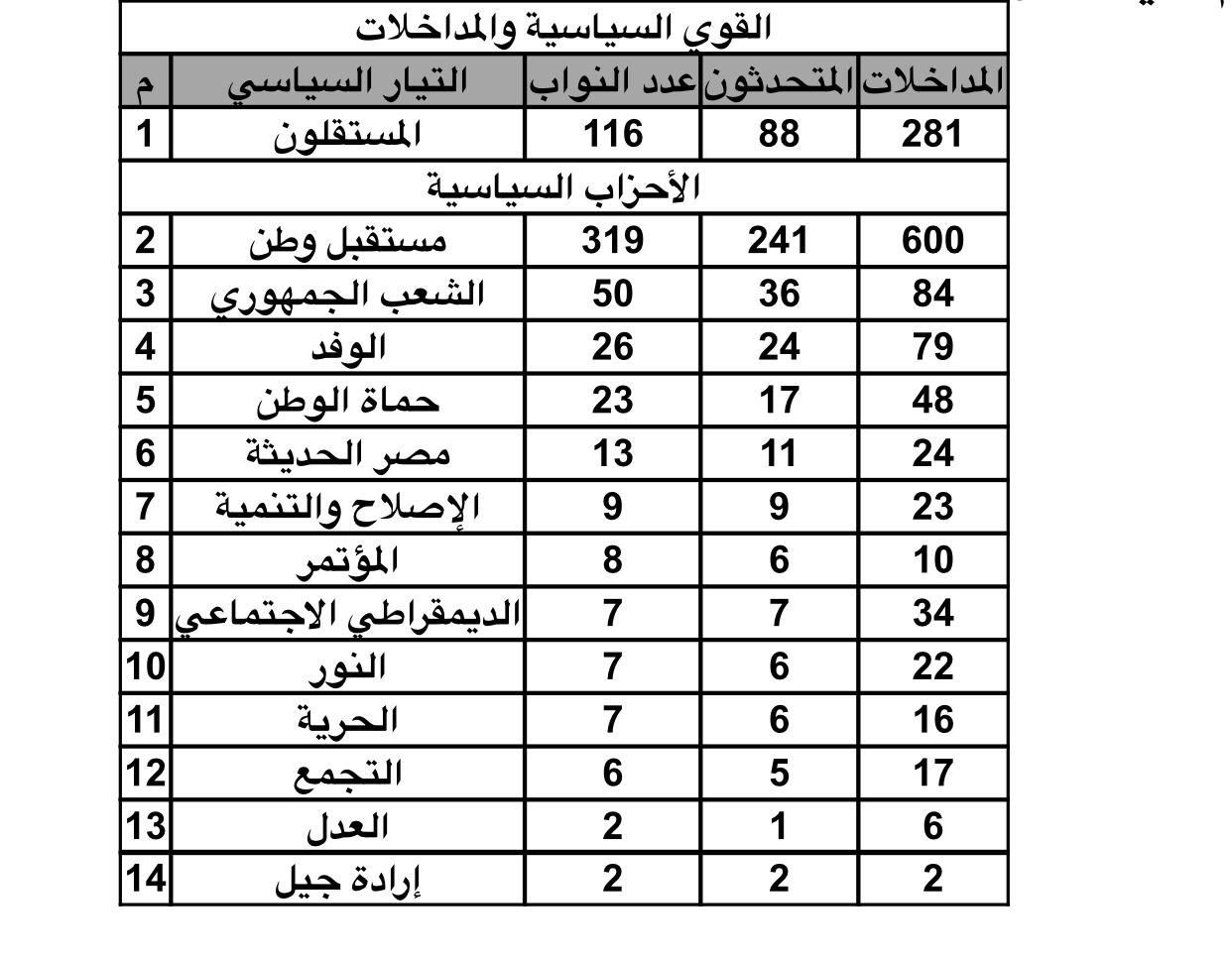 وبحكم العدد فقد جاء المستقلون تاليا لأغلبية مستقبل وطن بمشاركة 88 نائبا تقدموا بعدد 281 مداخلة في نسب تتقارب مع الأغلبية البرلمانية بما يكشف حيوية وتفاعل وحرص على المشاركة، وهو ما يمكن رصده لدى غالبية الكتل البرلمانية المتواجدة في المجلس، حيث تكررت ذات المؤشرات بالنسبة لأحزاب الوسط بداية من حزب الشعب الجمهوري بمشاركة 36 نائبا بإجمالي 84 مداخلة وحزب الوفد 24 نائبا بإجمالي 79 مداخلة.