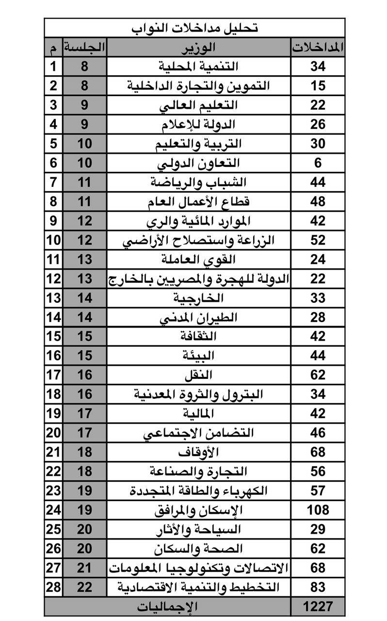 فمن بين 1227 مداخلة إجمالية في جلسات تقييم الأداءات الحكومية اقتصرت حصة رؤساء اللجان النوعية على 59 مداخلة فقط بنسبة 4,8 % كمؤشر غير مقبول ولا يليق بمواقعهم وأدوارهم.