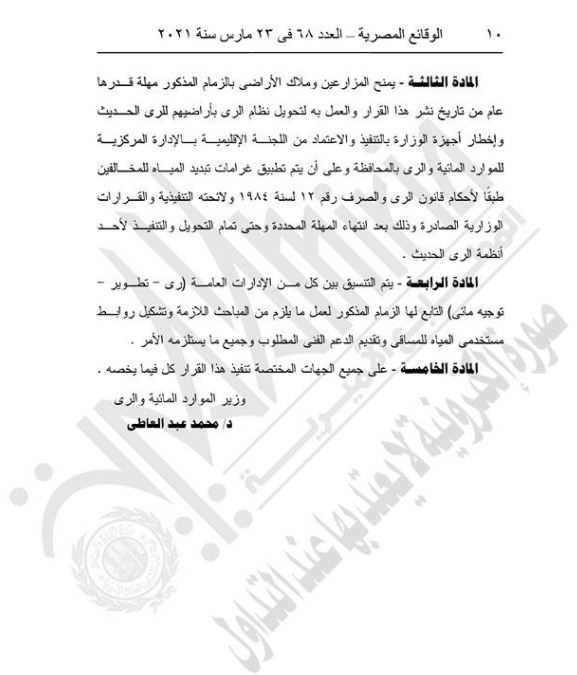 نشرت الجريدة الرسمية، اليوم الثلاثاء، قرار وزارة الموارد المائية والري رقم 30 لعام 2021، وجاء في المادة الأولى بأن تعدل المادة الثانية من القرار الوزاري رقم 54 لعام 2008 الصادر بتاريخ 30 يناير 2008، فيما تضمنه بشأن تعديل المادة 55 من الباب السادس باللائحة التنفيذية لقانون الري والصرف على النحو التالي: