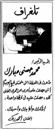 وفي غضون أيام فكر أحمد زكي برد التحية والتقدير للرئيس محمد حسني مبارك، بإرسال تلغراف في إحدي الجرائد الرسمية يشكر فيها الرئيس في تقليد هو الأول من نوعه.