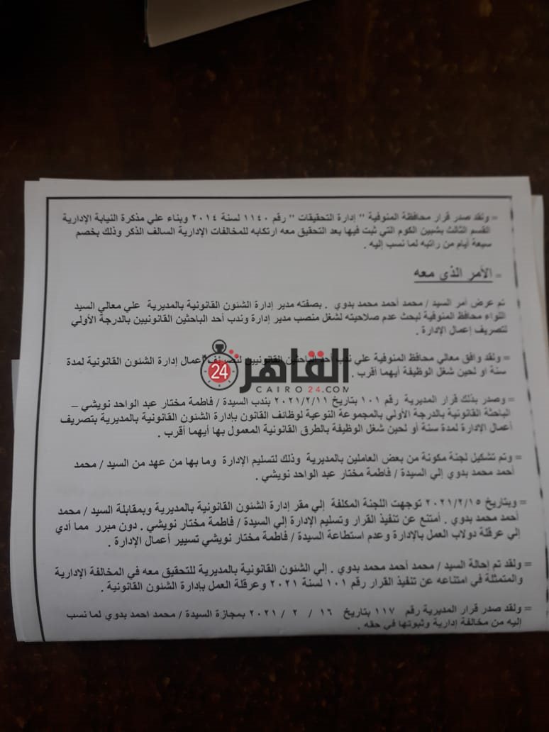 وبتاريخ 15 فبراير 2021 توجهت لجنة لتنفيذ قرار تسليم إدارة الشئون القانونية لأحد الباحثين امتنع مدير الإدراة عن ذلك وعطل سير العمل، مما استدعى مدير المديرية، أحالته لشئون القانونية لتحقيق معه في الواقعة، وأصدر مدير المديرية قرارًا بمجازاته لثبوت المخالفة.