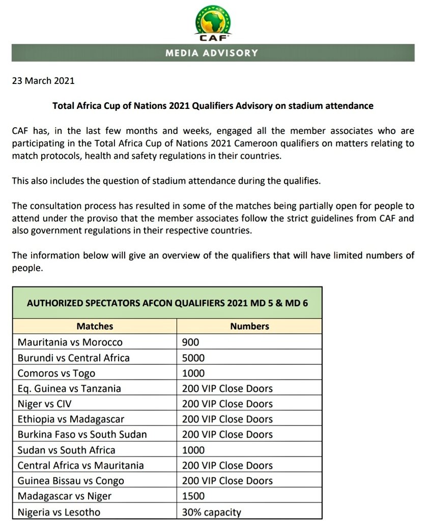 أصدر الاتحاد الإفريقي لكرة القدم "كاف"، برئاسة الجنوب إفريقي باتريس موتسيبي، بيانا توضيحيا من أجل حضور الجماهير مباريات التصفيات المؤهلة لكأس الأمم الإفريقية 2021 بالكاميرون.