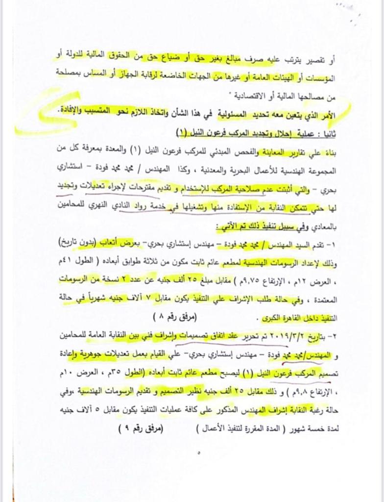 وذكر التقرير أنه بعد مراجعة القوائم المالية لصندوق الرعاية الاجتماعية والصحية للنقابة العامة، تبين ظهور مبلغ نحو 4.344 مليون جنيه ضمن حساب مشروعات تحت التنفيذ تحت مسمي أصول مركب النادي النهري، ويمثل قيمة المنصرف على عمليتي شراء وإحلال وتجديد المركب السياحي.