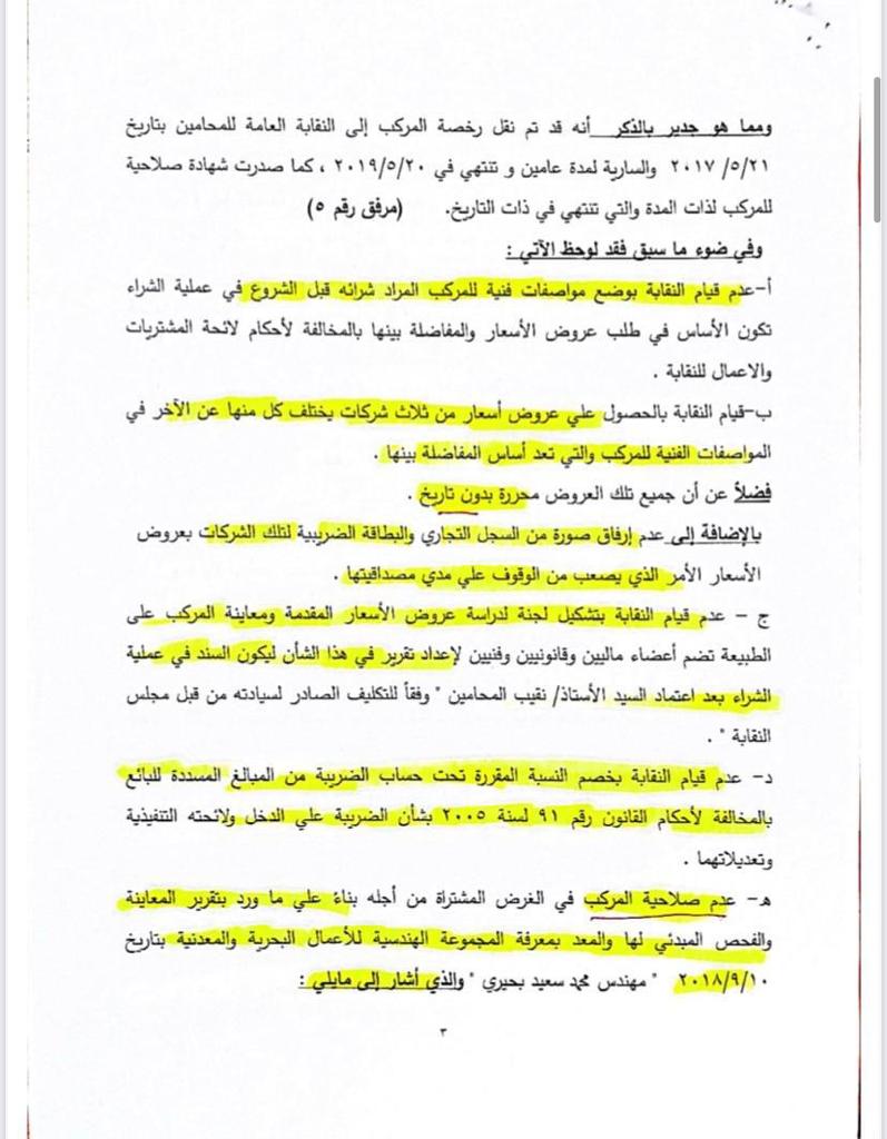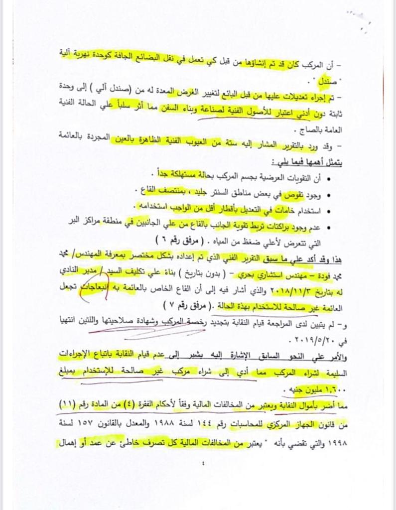 كما أشار التقرير المخالفات التي شابت عمليتي الشراء والإحلال، حيث بلغت تكلفة شراء المركب من شركة النيل للتجارة والمقاولات نحو 1.600 مليون، حيث أبرمت النقابة التعاقد في مايو 2017 دون النظر إلى عدم صلاحية المراكب للغرض المشترى من أجله، بعد تقرير المعاينة والفحص المبدئي، وأيضًا دون تشكيل لجنة متخصصة من النقابة لدراسة أسعار العروض المقدمة من الشركات، أو حتى معاينة حالة المركب.