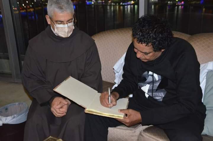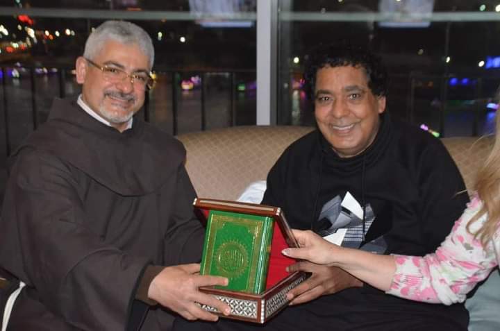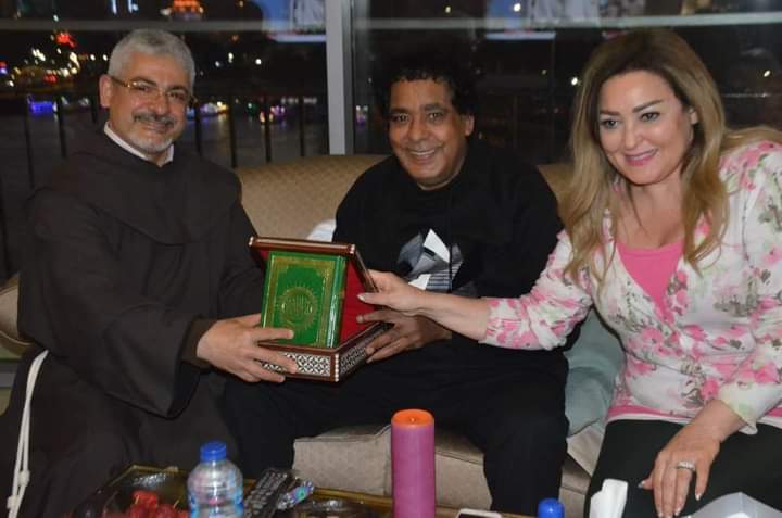 وأهدى الأب بطرس للكينج منير خلال الزيارة، “المصحف الشريف” بداخل علبة مطعمه بالصدف وتحمل أسماء الله الحسنى، مما أسعد الكينج كثيرا، لما تحمله هذه الهدية من أسمى معاني التسامح والسلام، وطلب من الأب دانيال أن يكتب إهداء على كتاب الله لوضعه في سيارته.