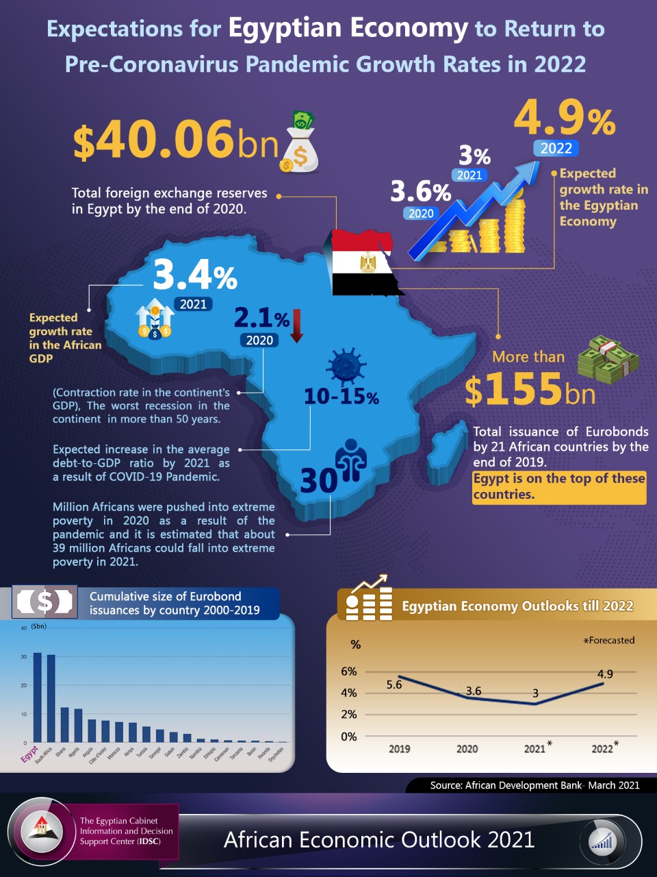 وتضمن الإنفوجرافيك توقعات البنك الإفريقي للتنمية لكل من الاقتصاد المصري والإفريقي بعد جائحة كورونا، ومن أبرزها: توقعات باستعادة الاقتصاد المصري معدلات نمو ما قبل جائحة كورونا في 2022، بنسبة نمو 4.9%، مقابل 3% في 2021، و3.6% في 2020، و5.6% في 2019، مقارنة بأغلب الاقتصادات العالمية، كما وصل إجمالي احتياطات النقد الأجنبي لمصر إلى نحو 40.06 مليار دولار بنهاية 2020.