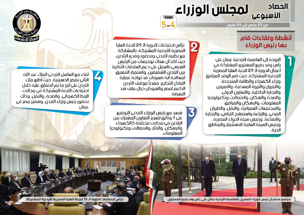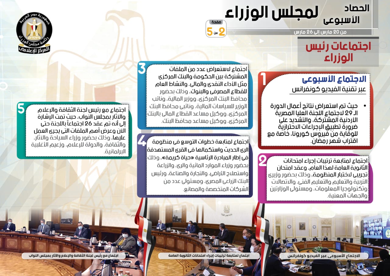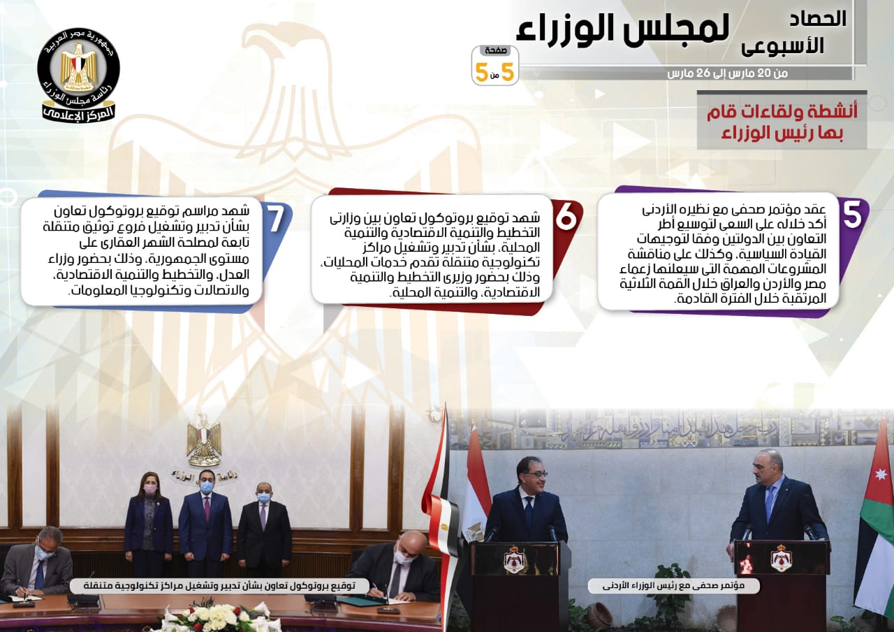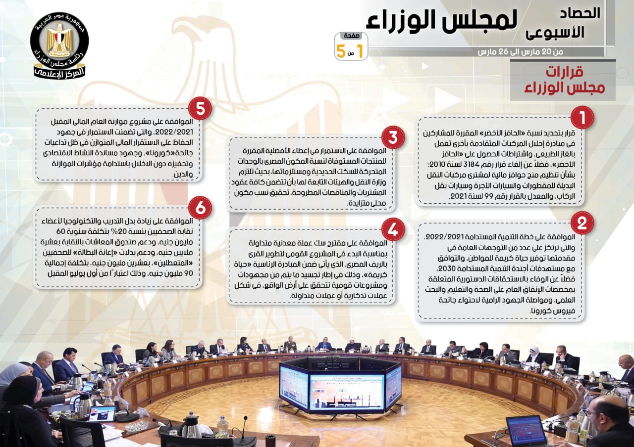 الحصاد الأسبوعي لمجلس الوزراء خلال الفترة من 20 إلى 26 مارس (إنفوجراف)