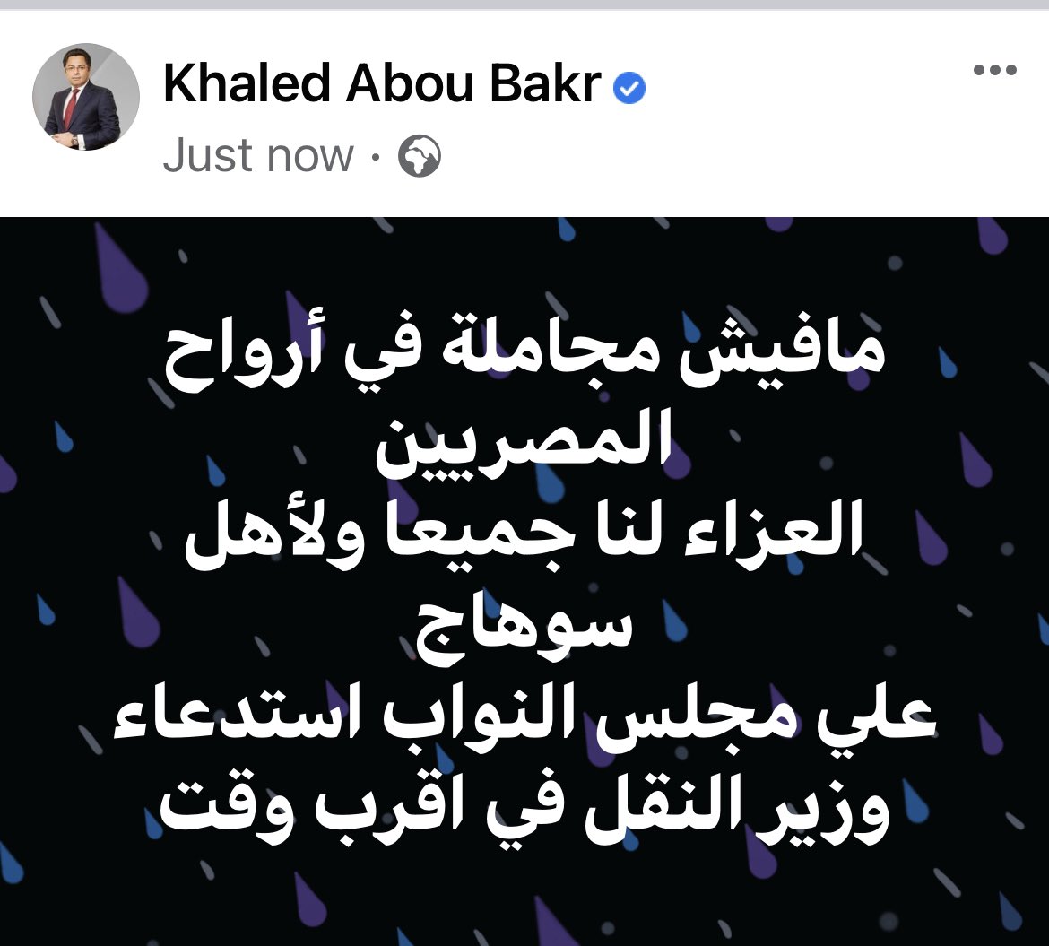 وقال أبو بكر عبر صفحته الرسمية على “فيس بوك”: "مافيش مجاملة في أرواح المصريين.. العزاء لنا جميعا ولأهل سوهاج.. على مجلس النواب استدعاء وزير النقل في أقرب وقت”.