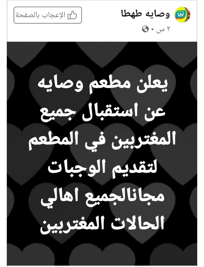 أعلن مطعم وصاية بطهطا بمحافظة سوهاج، عن استقبال جميع المغتربين في المطعم لتقديم الوجبات مجانًا لجميع أهالي الحالات المغتربين من مصابين وفيات تصادم حادثي قطاري بمركز طهطا.