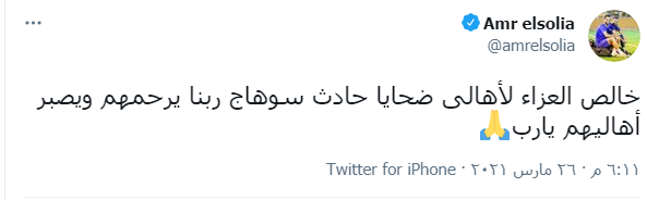 وكتب السولية عبر صفحته الشخصية على موقع “تويتر”: "خالص العزاء لأهالي ضحايا حادث سوهاج ربنا يرحمهم ويصبر أهاليهم يا رب".