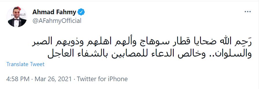 فيما قال النجم أحمد فهمي: “رحم الله ضحايا قطار سوهاج وألهم أهلهم وذويهم الصبر والسلوان.. وخالص الدعاء للمصابين بالشفاء العاجل”.
