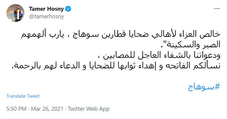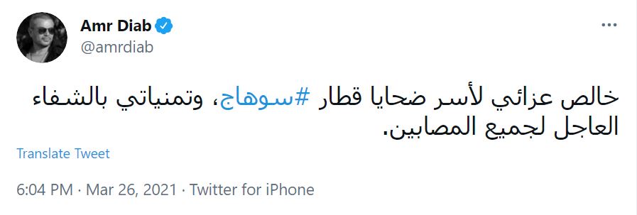 ومن بين هؤلاء كان الهضبة عمرو دياب الذي كتب على تويتر قائلًا: “خالص عزائي لأسر ضحايا قطار سوهاج، وتمنياتي بالشفاء العاجل لجميع المصابين”.