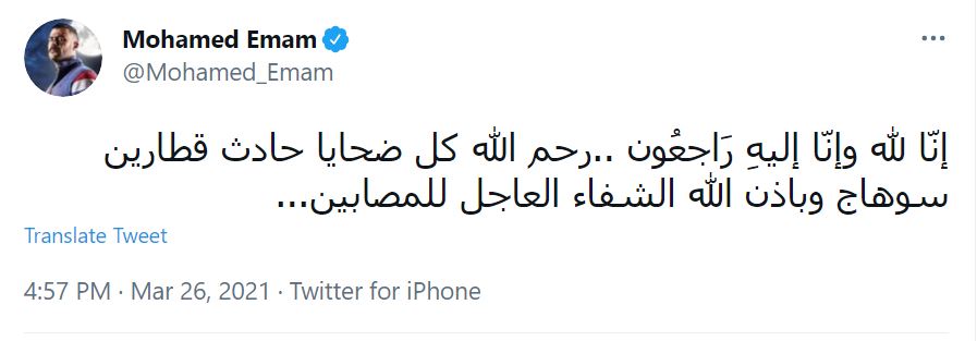 وقال الفنان محمد إمام: “إنا لله وإنا إليه راجعون رحم الله كل ضحايا حادث قطارين سوهاج وبإذن الله الشفاء العاجل للمصابين”.
